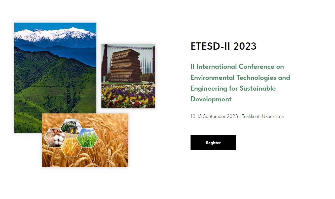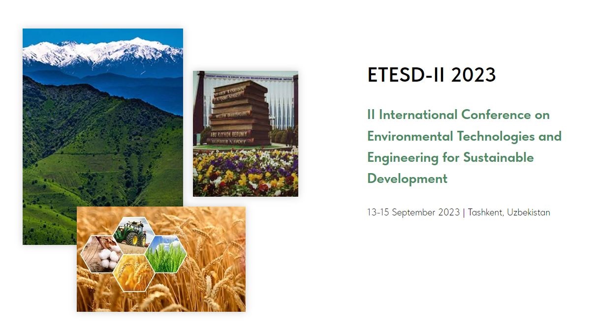 National Research University “Tashkent Institute of Irrigation and Agricultural Mechanization Engineers» with the support scientists of Iowa State University, North Dakota State University and The Ohio State University (USA), Ondokuz Mayis University and the Association of Ecological Agriculture Organization (Turkey), University Technology Malaysia (Malaysia), Angel Kanchev University of Ruse (Bulgaria), Bangladesh Agricultural University (Bangladesh), S.Seifullin Kazakh Agro Technical University and South Kazakhstan University named after M.Auezov (Kazakhstan) organize II International Conference on Environmental Technologies and Engineering for Sustainable Development (ETESD-II 2023) on 13-15 September 2023 in Tashkent, Uzbekistan.