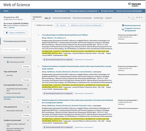 Материалы конференции в виде статей на английском языке публикуются в журнале Journal of Physics: Conference Series (JPCS), индексируемом международными базами WoS/Scopus (Q3).
