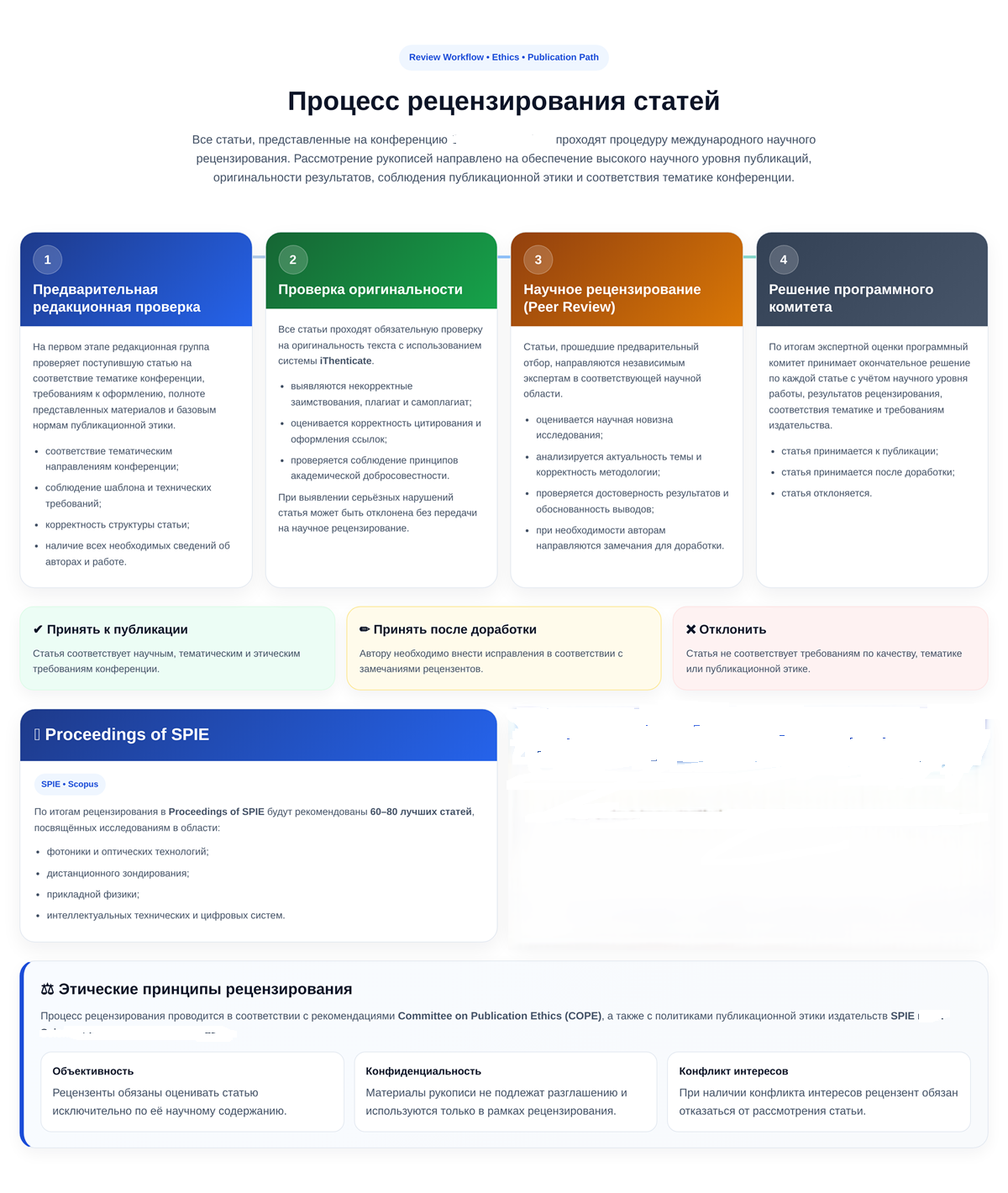 рассматриваются в соответствии с рекомендациями COPE, а также политиками публикационной этики издательств SPIE и EDP Sciences.