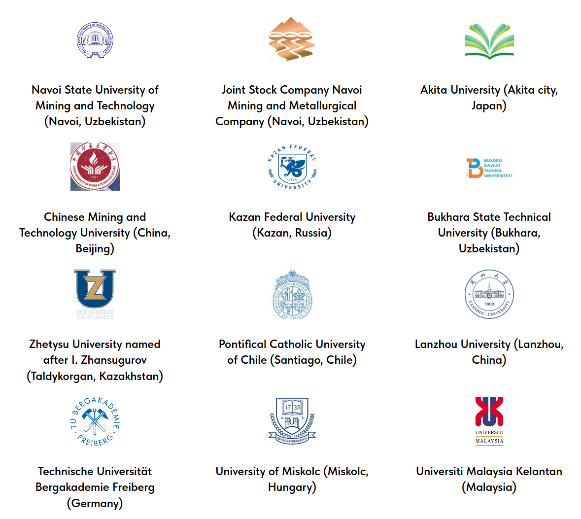 Конференция проводится при поддержке ведущих университетов и научно-производственных организаций из разных стран мира, что обеспечивает высокий научный уровень мероприятия и широкие возможности для международного взаимодействия. Среди партнеров конференции - Akita University (Япония), Chinese University of Mining and Technology (Китай), Международный союз научных и инженерных общественных объединений (Россия), АО «Навоийский горно-металлургический комбинат» (Узбекистан), Казанский федеральный университет (Россия), Pontifical Catholic University of Chile (Чили), Satbayev University (Казахстан), Technische Universität Bergakademie Freiberg (Германия), University of Miskolc (Венгрия), Universiti Malaysia Kelantan (Малайзия), Жетысуский университет имени И. Жансугурова (Казахстан).