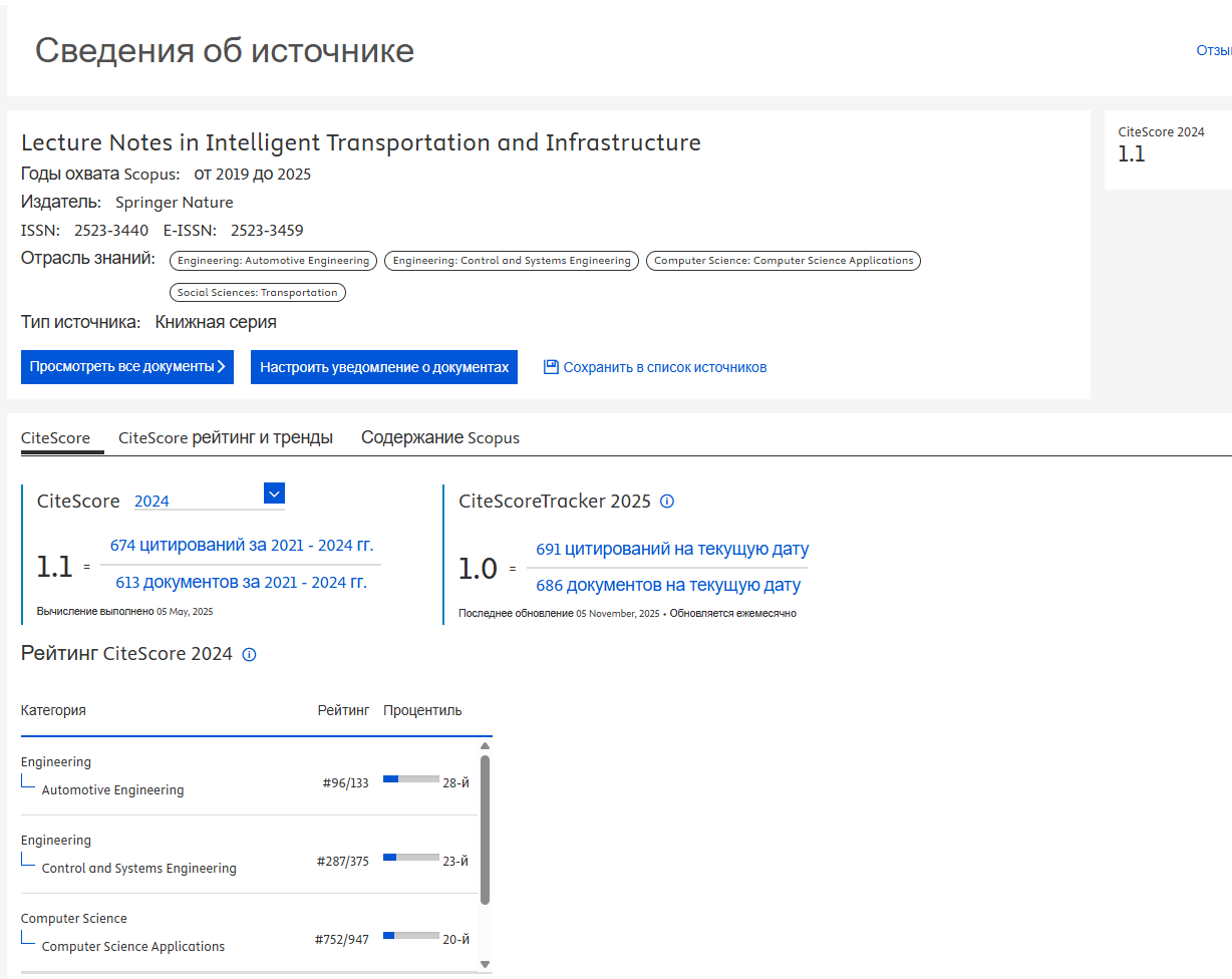 Lecture Notes in Intelligent Transportation and Infrastructure индексируется в базе данных Scopus и относится к книжной серии издательства Springer. По данным SCImago серия не имеет собственного квартиля, так как не ранжируется как журнал в SJR. По метрике CiteScore в Scopus серия имеет квартиль Q3, а после индексации отдельные публикации отображаются в профилях авторов как BOOK CHAPTER.
